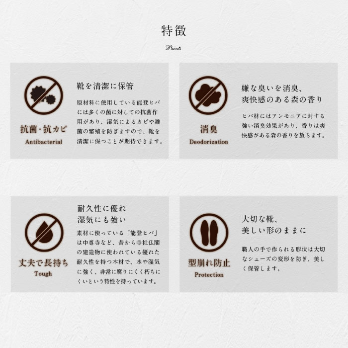 抗菌・消臭に優れた能登ヒバを原材料に使用し、従来のシューキーパーの型崩れ防止の機能に除菌・消臭の効果も付加できました。