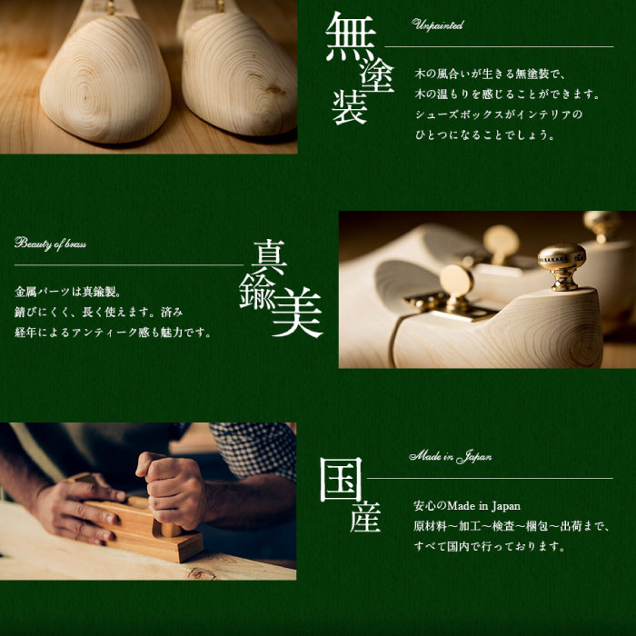 靴木型職人が一本一本削り出し、また、金具も一からデザインし、真鍮を用いてレーザー加工も施したこだわりの逸品です。