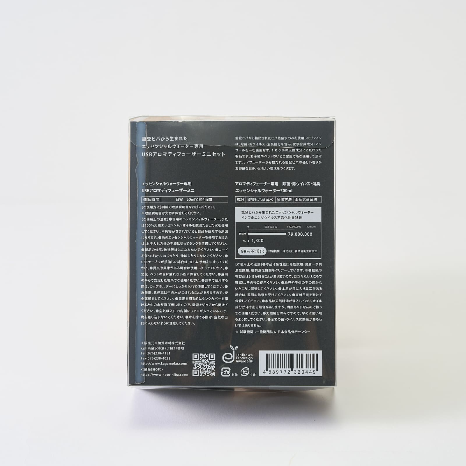 | 付属品 | アロマディフューザーミニ、専用エッセンシャルウォーター500ml、USBケーブル、取扱説明書、保証書 |