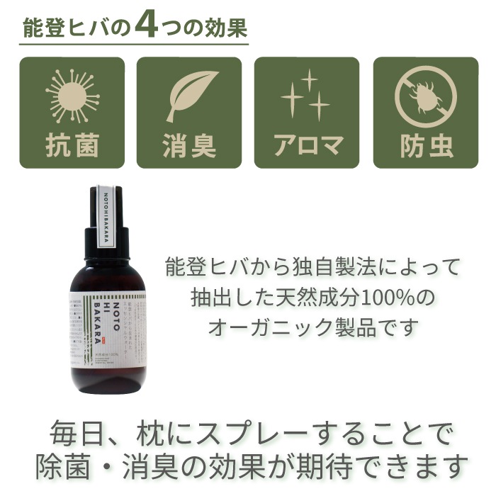 能登ヒバから独自製法によって抽出した天然成分100%の除菌・除ウイルス・消臭スプレーをセットにしました。