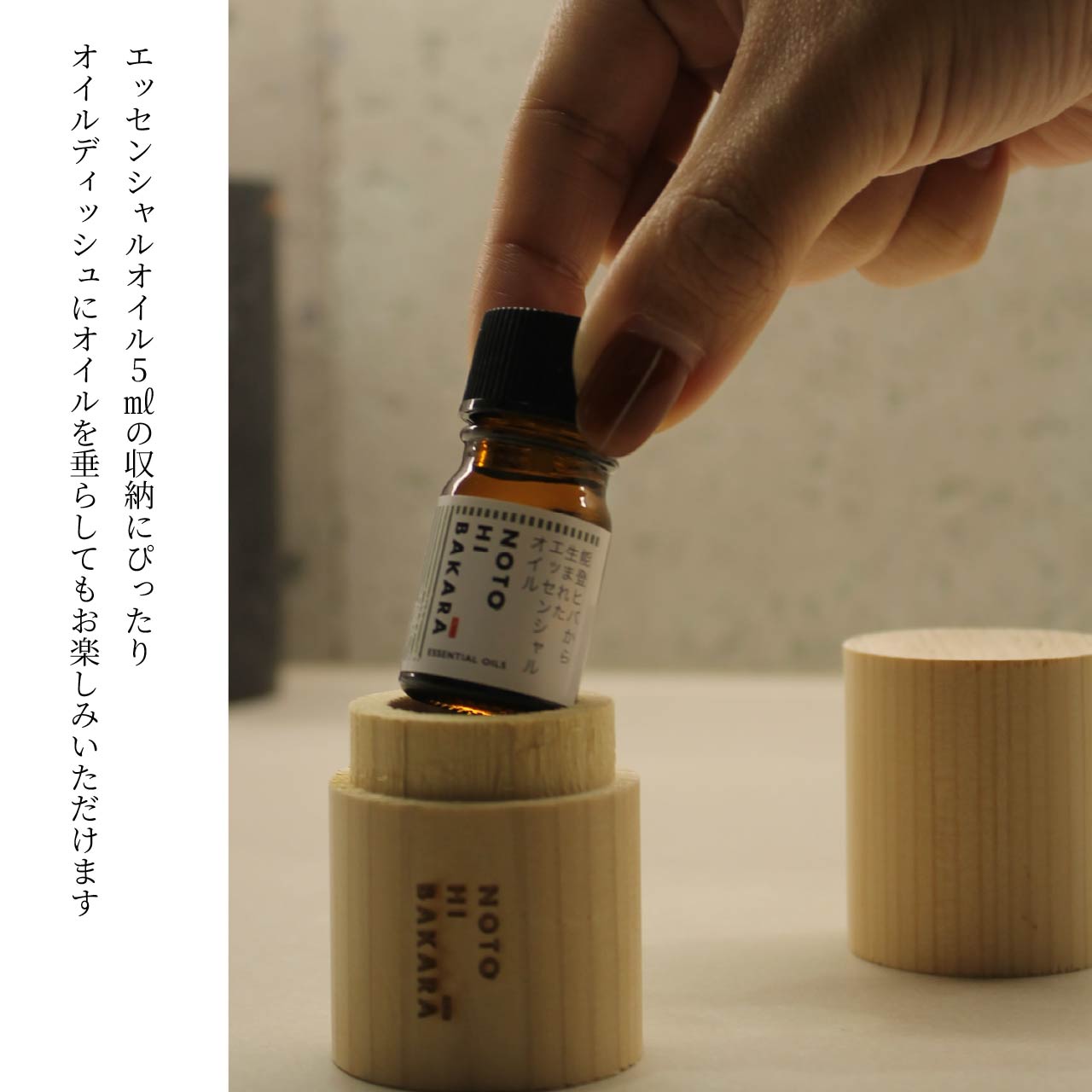 能登ヒバ精油5mlは、お手持ちのディフューザーやティッシュに1滴垂らして手軽に香りを楽しめます。